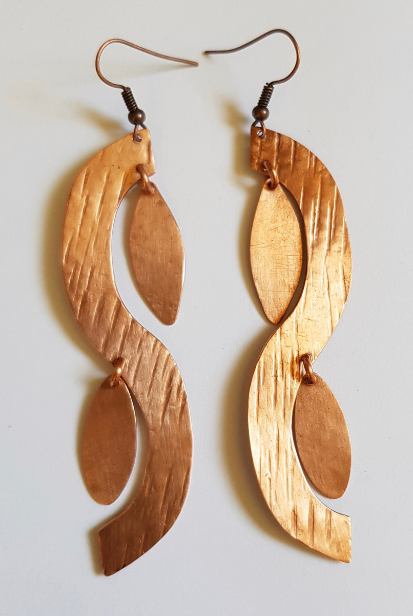Lightweight curved copper earrings with nickel free brass ear wires, inspired by the artwork from the Shiwezwa record. The copper is recycled from old geysers (water heaters), and each piece is lovingly hand-crafted by Elina and Memory from FREE, a woman's jewellery-making collective in a poor compound in Lusaka, Zambia, as part of this special collaboration.